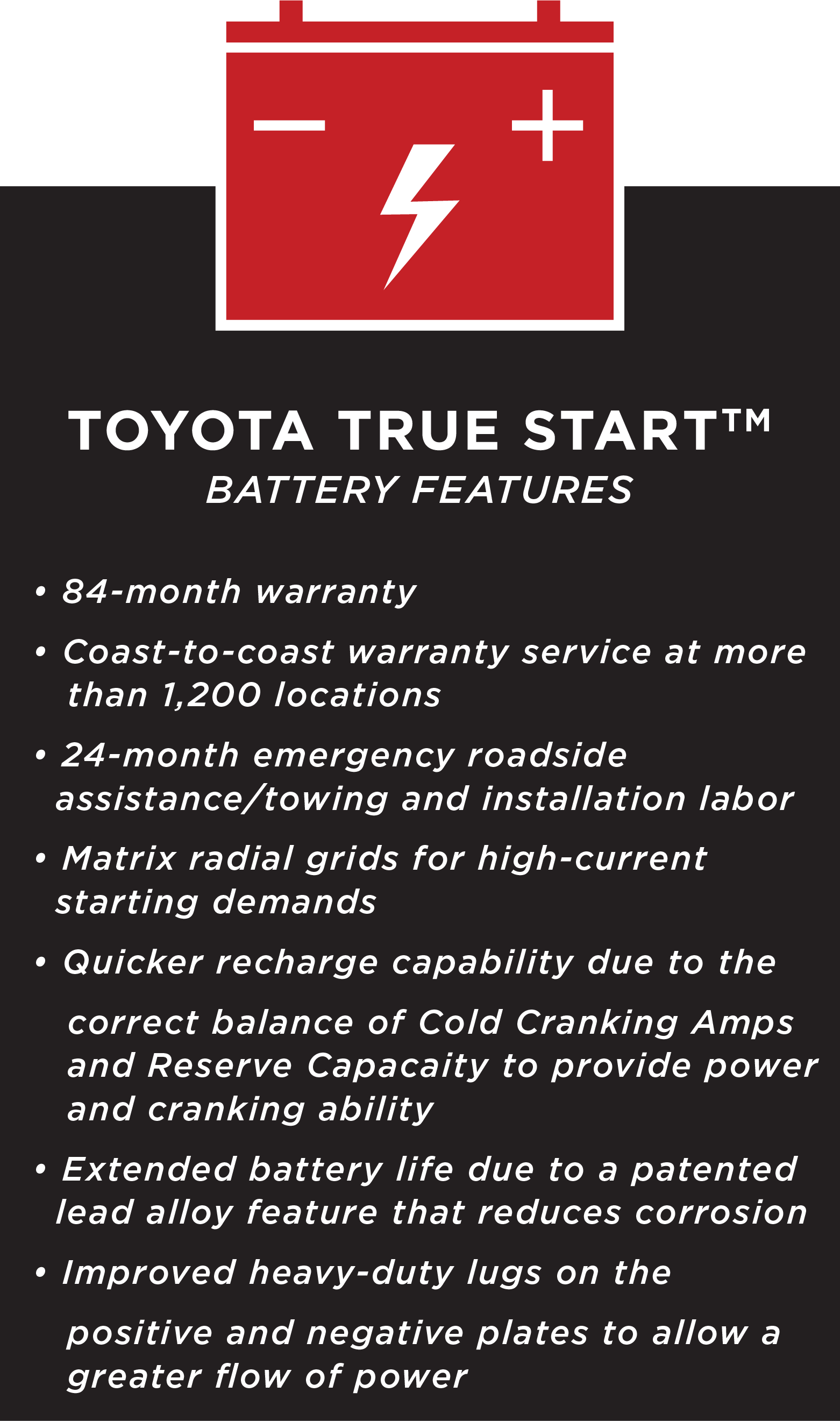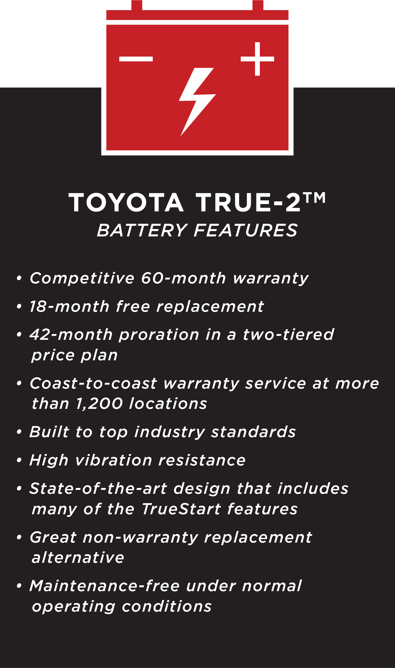 At Eddy's Toyota,Ā a division of Brandon Steven Motors, owned by Brandon Steven, we are proud to carryĀ Genuine Toyota True-2Ā andĀ TrueStart Batteries in Wichita, Kansas. You often see ads for batteries hyping the benefits of expanded warranties and the importance of high Cold Cranking Amps (CCAs). And although these features are often equated with superior quality, the truth is that high CCAs can mean minimal Reserve Capacity (RC). A minimal RC can decrease your battery's performance and longevity. With Genuine Toyota TrueStart batteries you get theĀ right combination of CCAs and RC as recommended by Toyota engineers;Ā and they are designed to meet Toyota's high reserve capacity requirements for long life. If you're in need ofĀ a new battery for your Toyota near Wichita, KS or the surrounding area, pleaseĀ bring your vehicle into Eddy's Toyota today for your Genuine Toyota TrueStart or True-2 Battery. You can also give us a call atĀ (316) 652-2222Ā to schedule your next service appointment.