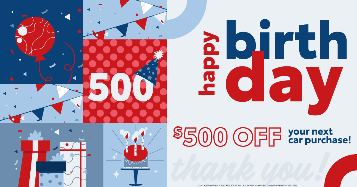 Happy Birthday from all of us at Eddy's Toyota! We want to celebrate this special day by giving YOU $500 off your next vehicle purchase! Take advantage of this HUGE birthday present and rejoice with your new ride! Enjoy your big day with us at 7333 East Kellogg Dr. in Wichita, KS.